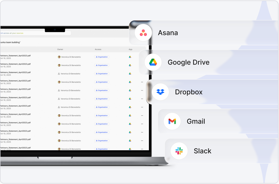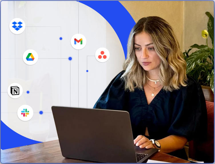 Search across all your tools in one go - Google Drive, Slack, Gmail, Dropbox, Notion, Asana, and more.