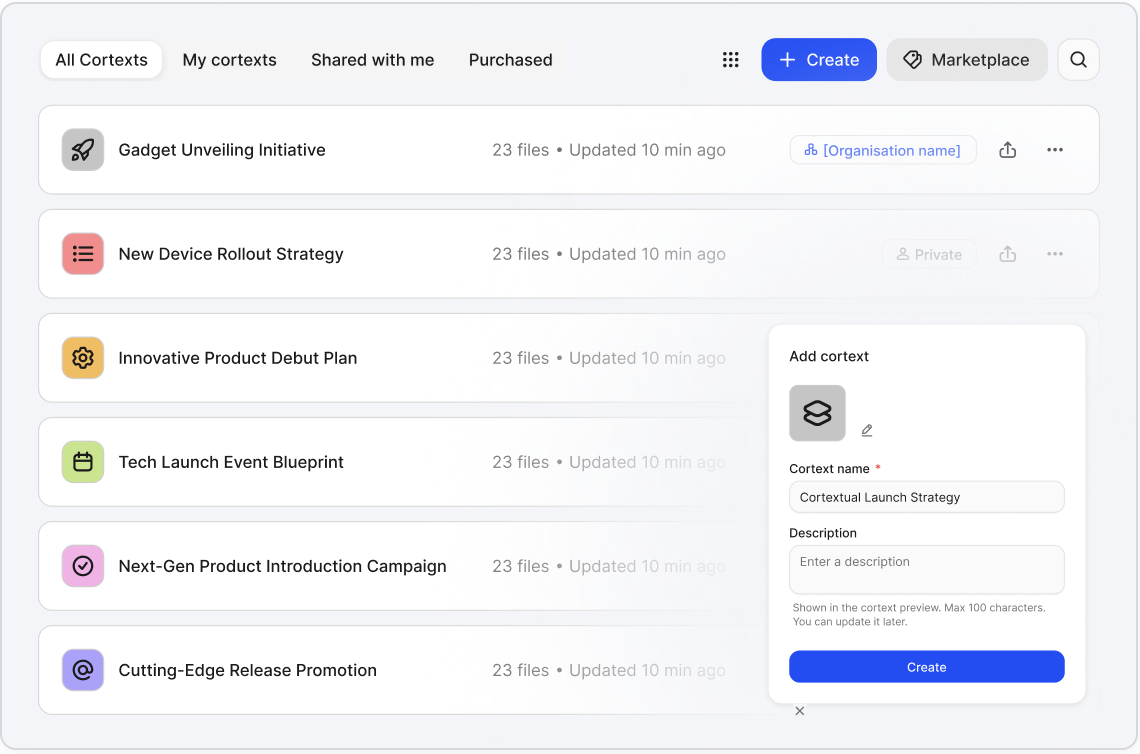 Your expertise doesn’t have to live in presentations or meetings alone. Package your know-how into Cortexts trained on your data, and give clients direct access to your insights anytime they need them.