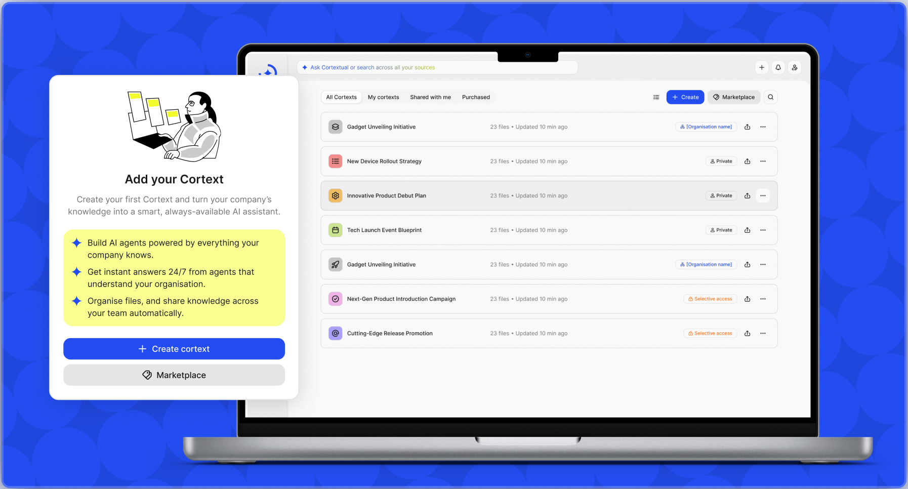 Your expertise doesn’t have to live in presentations or meetings alone. Package your know-how into Cortexts trained on your data, and give clients direct access to your insights anytime they need them.