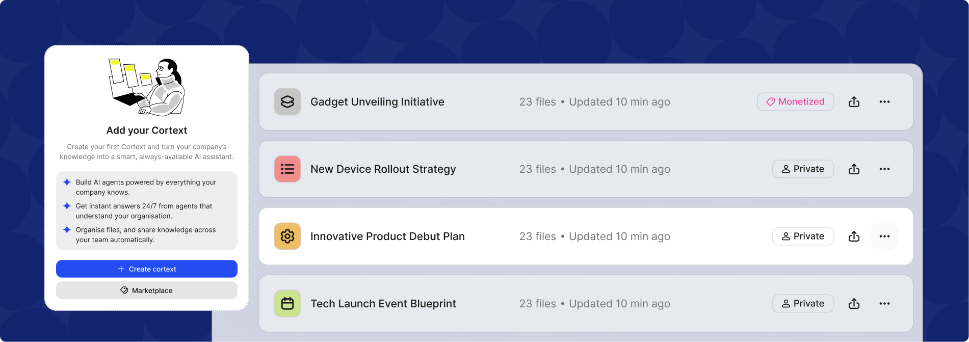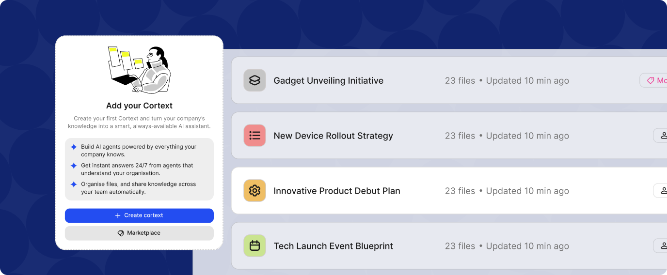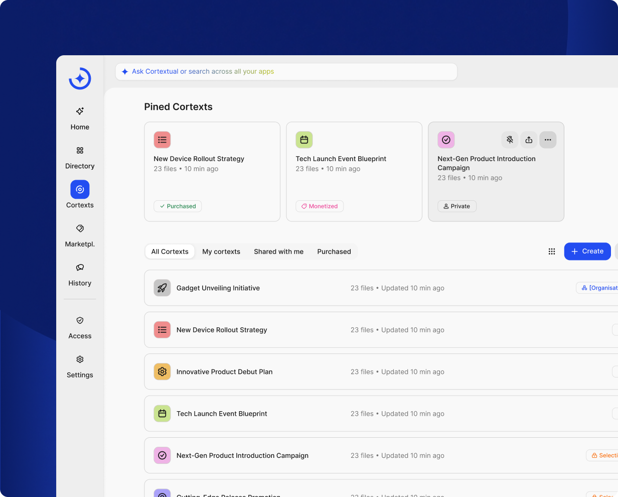 Take your knowledge out of drives and into the world. Build cortexts - AI knowledge hubs that learn from your content, guide users, and let you share or even sell your expertise at scale.