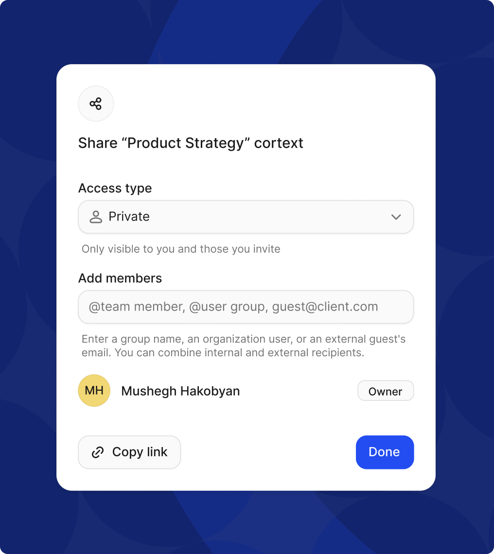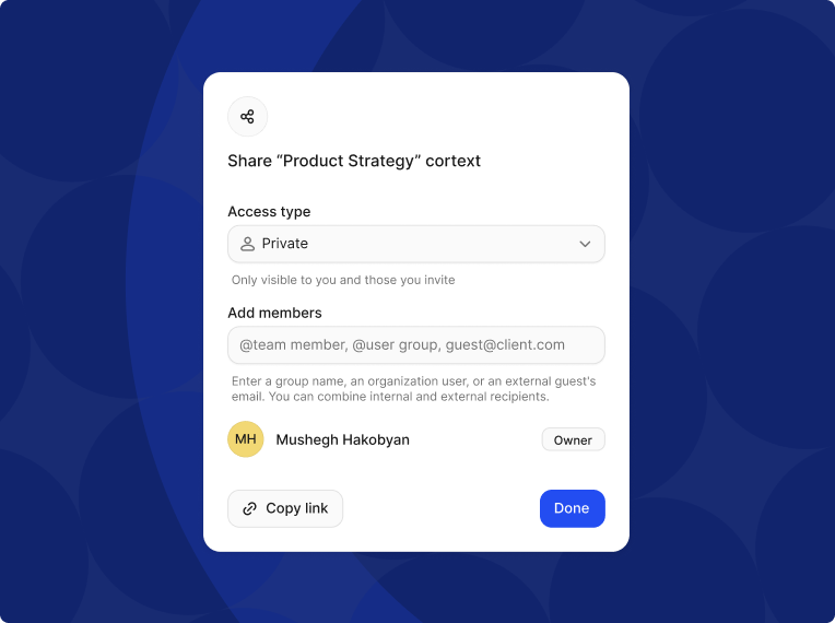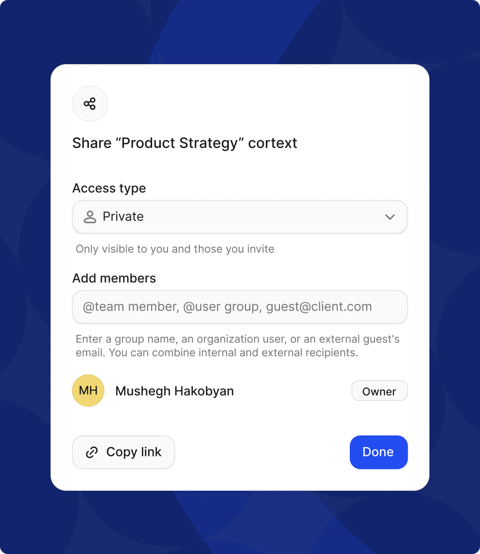 | Internal contexts | Employees / Teams | Role-based access | Product strategy documentation, HR policy hubs, IT manuals, etc. |