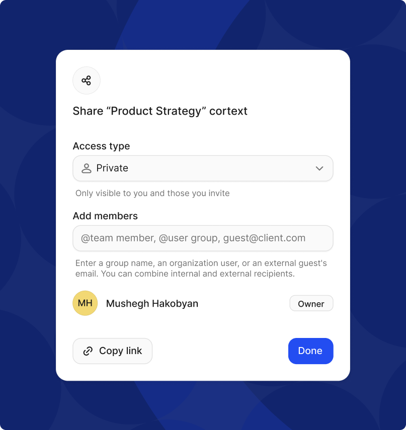 | External private cortexts | Clients / Partners | Email invite or OTP | Client-specific project knowledge, vendor compliance guides. |