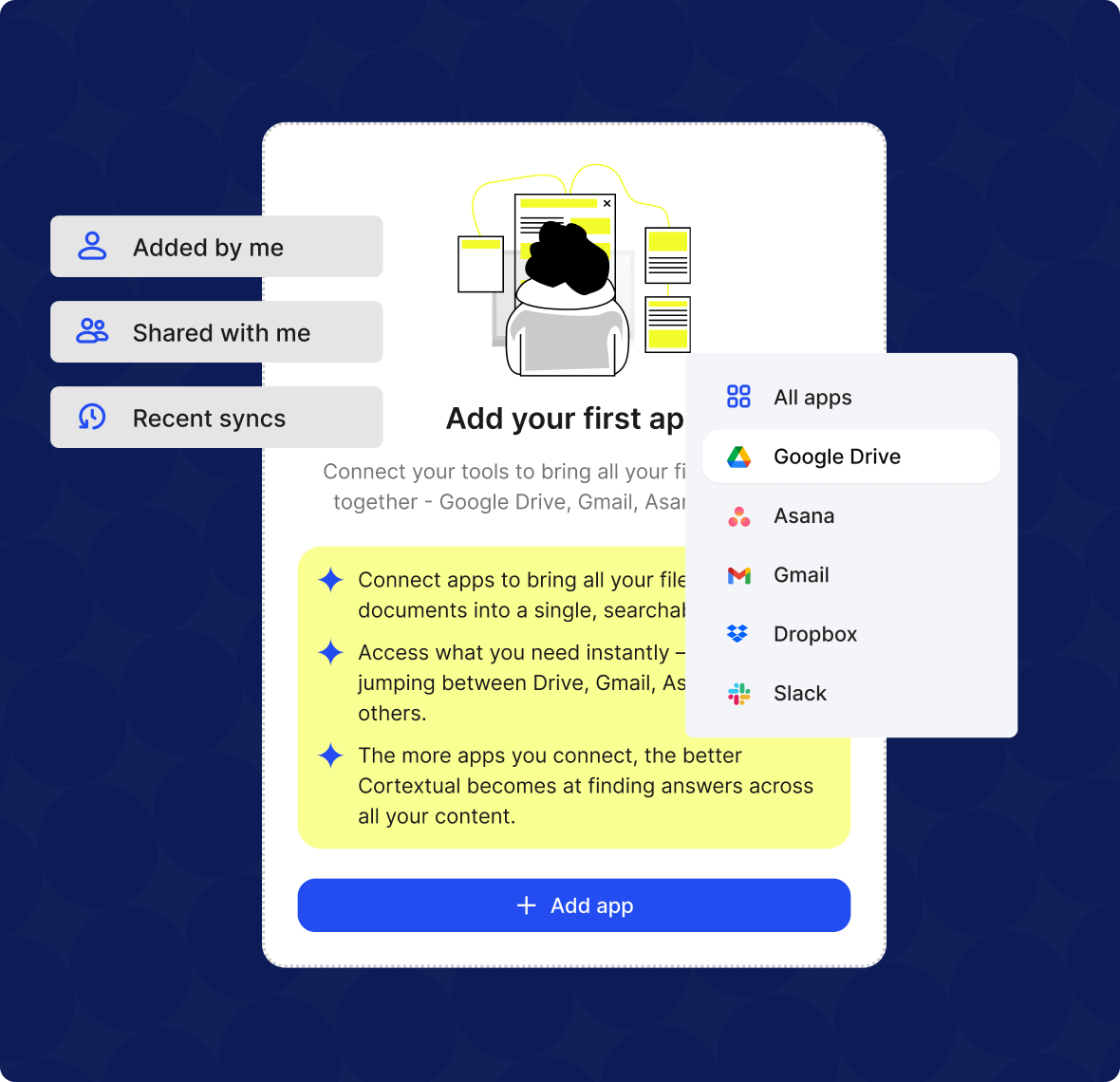 Quickly connect your organisation's important platforms (Drive, Slack, Asana, etc.). - 2